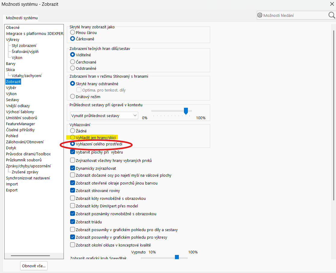 Měl jsem zapnuté pouze Vyhladit jen hrany/skici, tak jsem to přepnul na Vyhlazení celého prostředí, viz. příloha.