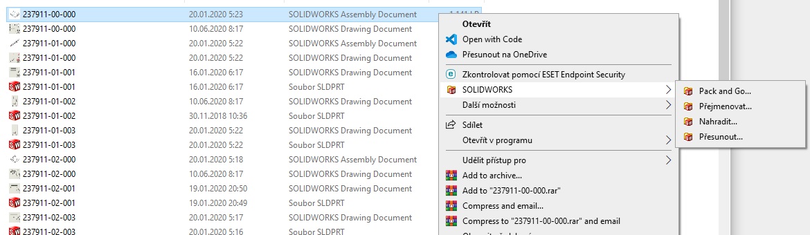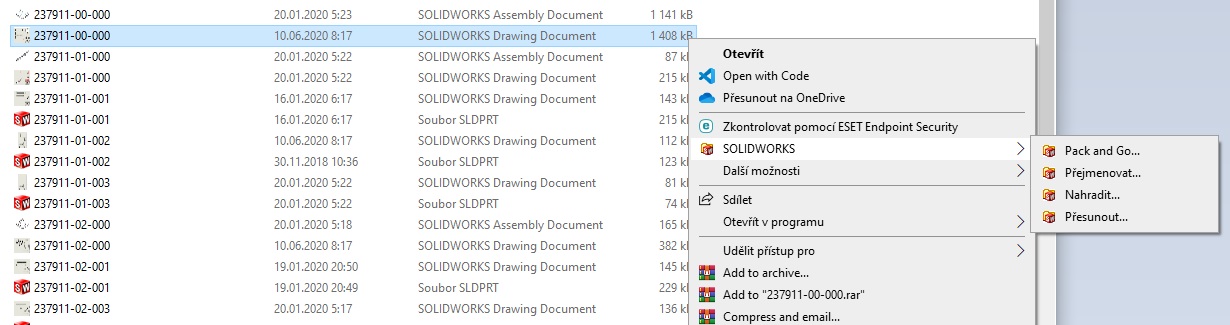 Pokud chci v průzkumníkovi pres solidworks využit funkci „přejmenovat, nahradit, přesunout“, tak mi to nabídne jen u sestavy a výkresu u samotného dílu bohužel ne (viz.screeny).