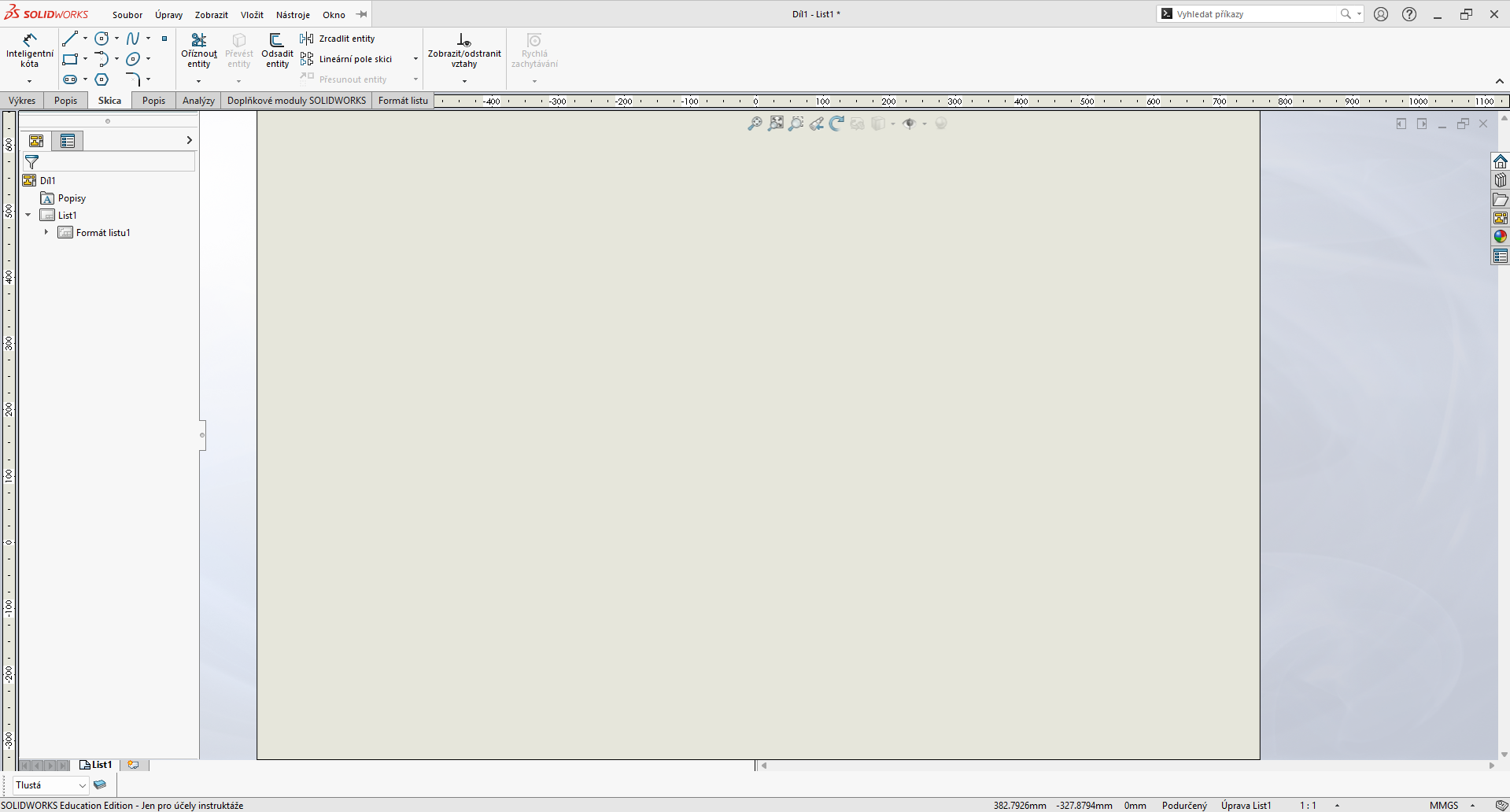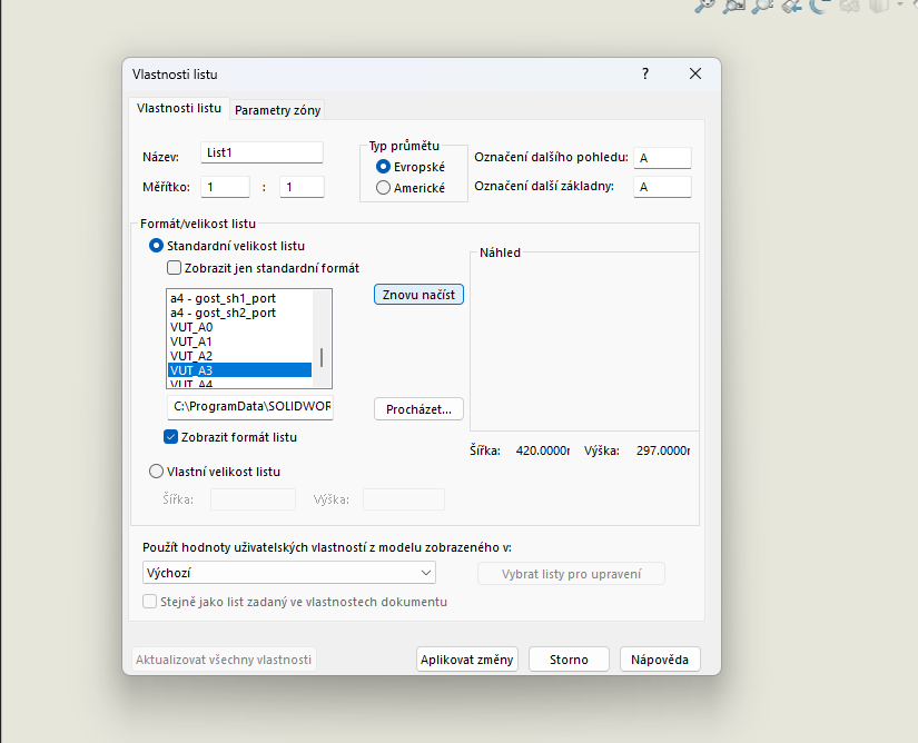 Při vytváření dílů vidím uživatelské vlastnosti (školy). Když přejdu do výkresu tak ve formátu listu najdu i školní formáty listů. Zvolím školní formát a potvrdím změny. nezobrazí se mi žádný výkres, ani základní iso formáty.
