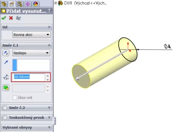 Založte nový díl. V rovině Přední načrtněte kružnici o průměru 4 mm a vysuňte ji do vzdálenosti 10 mm.