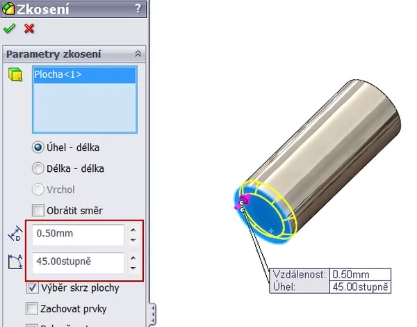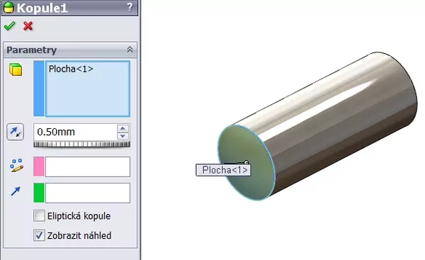 Na jedné straně kolíku vytvořte kopuli příkazem Kopule. Poloměr zaoblení nastavte na 0,5 mm.