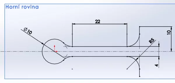 V rovině Horní načrtněte následující skicu. Pamatujte na konstrukční prvky, které už znáte. Oblouky mají mezi sebou tečnou návaznost. Náčrt musí být plně určený.