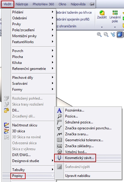 Z nabídky Vložit vyberte ze záložky Popisy příkaz Kosmetický závit.