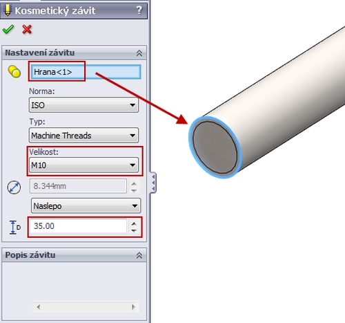 Označte hranu vysunutého modelu. V možnostech příkazu Kosmetický závit zvolte velikost závitu M10. Délku závitu volte třicet pět milimetrů.