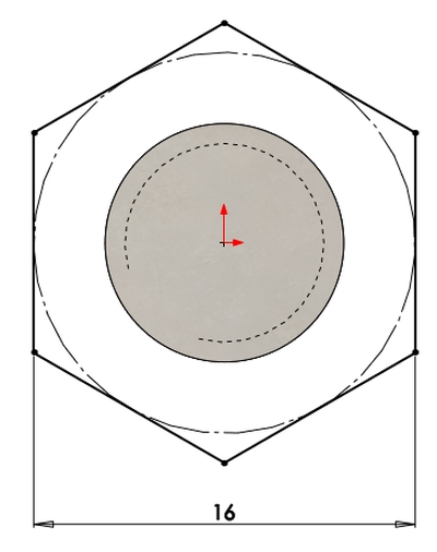 Na čelní straně dříku šroubu založte novou skicu. Nakreslete šestiúhelník a zakótujte vzdálenost protilehlých stran kótou o velikosti šestnáct milimetrů. Dále vysuňte hlavu šroubu do vzdálenosti sedm milimetrů.
