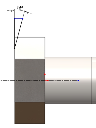 Založte novou skicu tak, abyste viděli bokorys šroubu. V této skice nakreslete trojúhelník a zakótujte úhel patnáct stupňů. Jedná se pouze o kosmetickou úpravu sražení hran na hlavě šroubu.