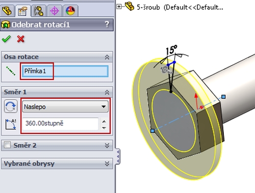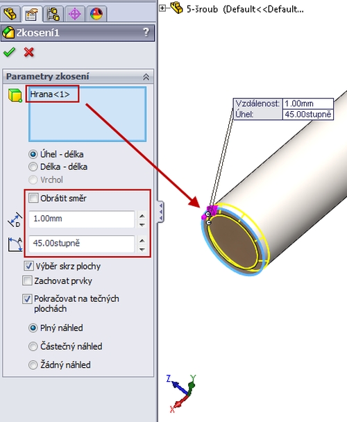 Poslední úpravou je sražení dříku šroubu. Označte hranu a zvolte velikost úkosu jeden krát čtyřicet pět stupňů.