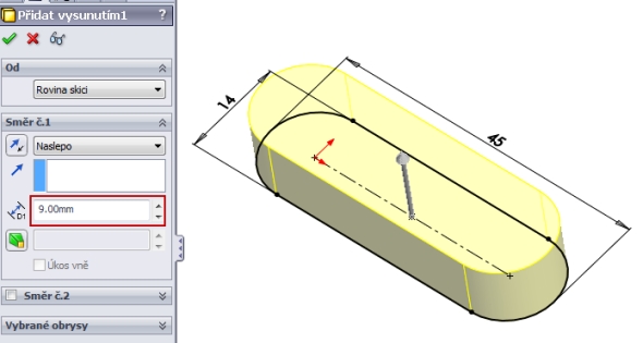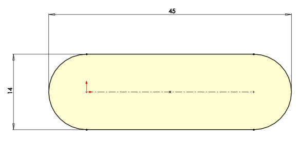 Založte v Horní rovině náčrt a nakreslete příkazem Drážka tvar těsného pera. Rozměry pera jsou čtrnáct a čtyřicet pět milimetrů. Jeden ze středů oblouků sjednoťte s počátkem souřadného systému.