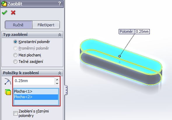 Zaoblete ostré hrany poloměrem dvacet pět desetin milimetru. Pro zaoblení použijte příkaz Zaoblit a pro výběr hran použijte označení horní a spodní plochy pera.