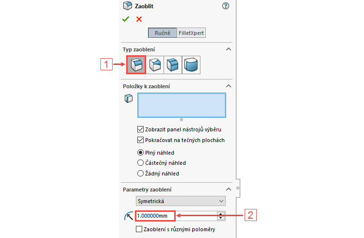 Zkontrolujte výchozí výběr nastavení zaoblení → Zaoblení o konstantní velikosti (1) a nastavte poloměr zaoblení 1 mm (2).