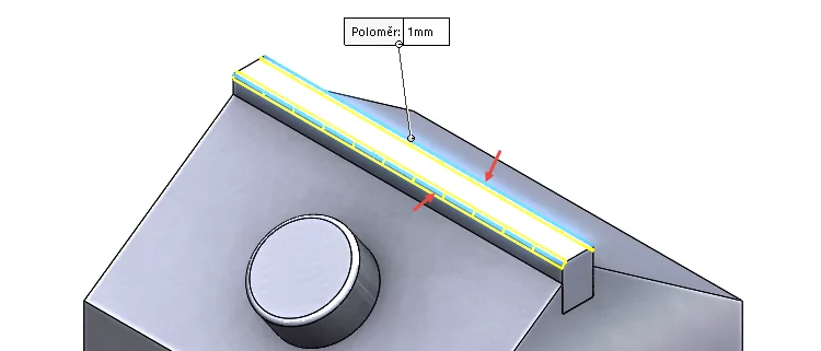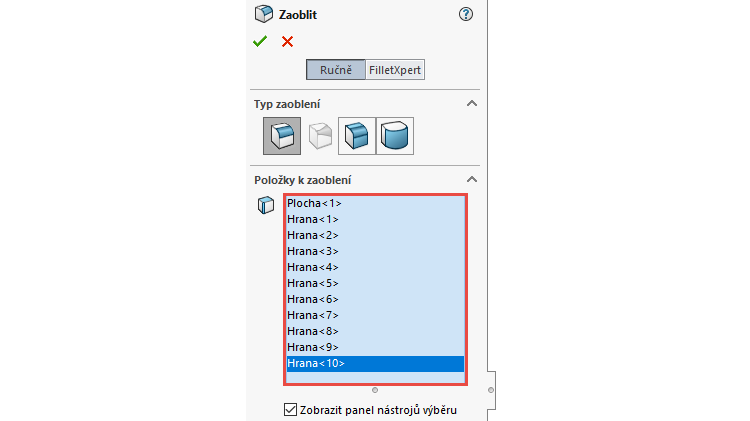 Vzhledem k tomu, že nelze udělat zaoblení hran na více tělech současně, musíme udělat zaoblení hran postupně. Vznikne tak ve FeatureManageru několik prvků Zaoblit.