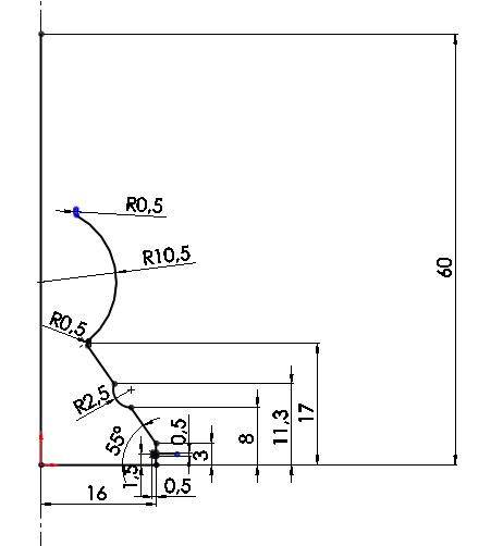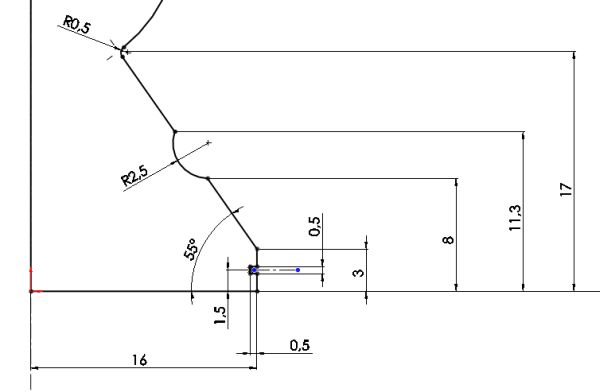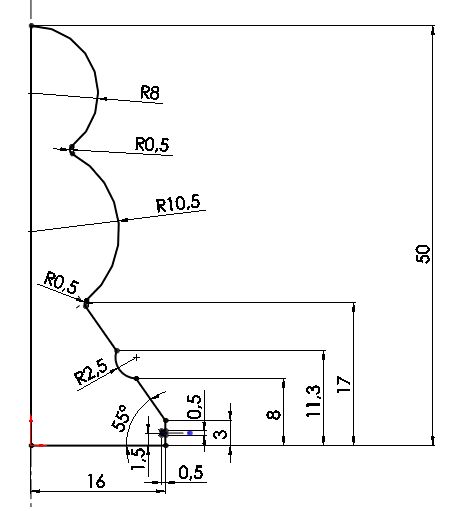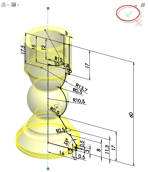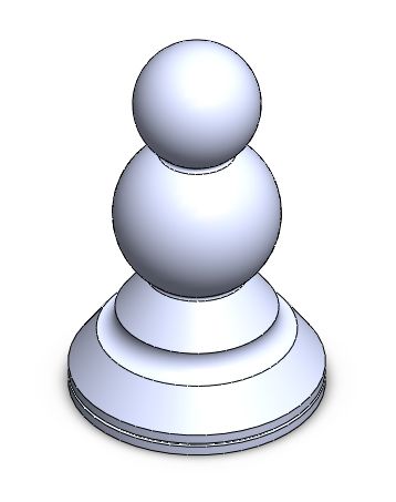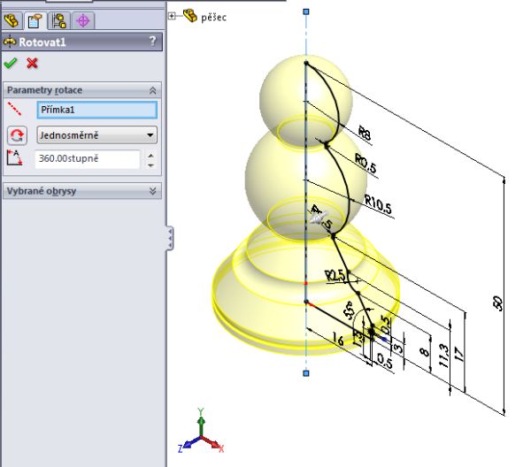Vymodelovat model pěšce je poměrně jednoduchou záležitost. Model vznikne rotací profilu kolem osy, nakresleného v rovině Přední. Při tvorbě skici dodržujte tečnou návaznost mezi oblouky pomocí tečné vazby.