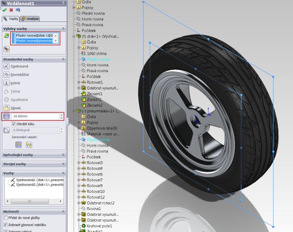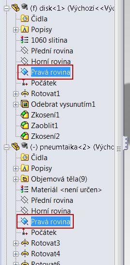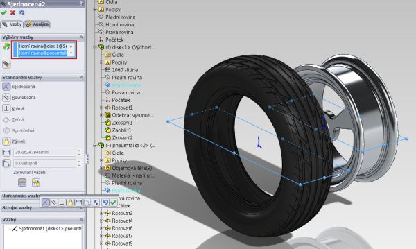 Vazby sestavy bude v tomto případě nejjednodušší vytvořit sjednocením podle rovin. Vyberte ve stromu sestavy Pravou rovinu ráfku a Pravou rovinu pneumatiky.