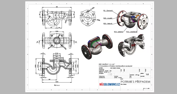 Model potrubí s přepadem je určen pro mírně pokročilé uživatele SOLIDWORKSu. Prostudujte si výkresovou dokumentaci a pokuste se součást sami vymodelovat.